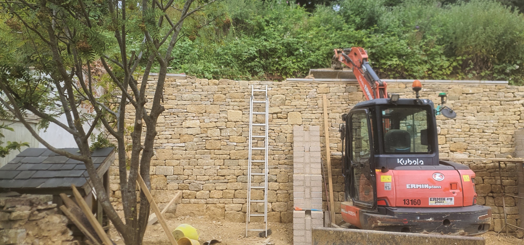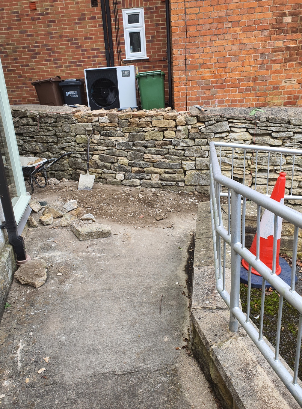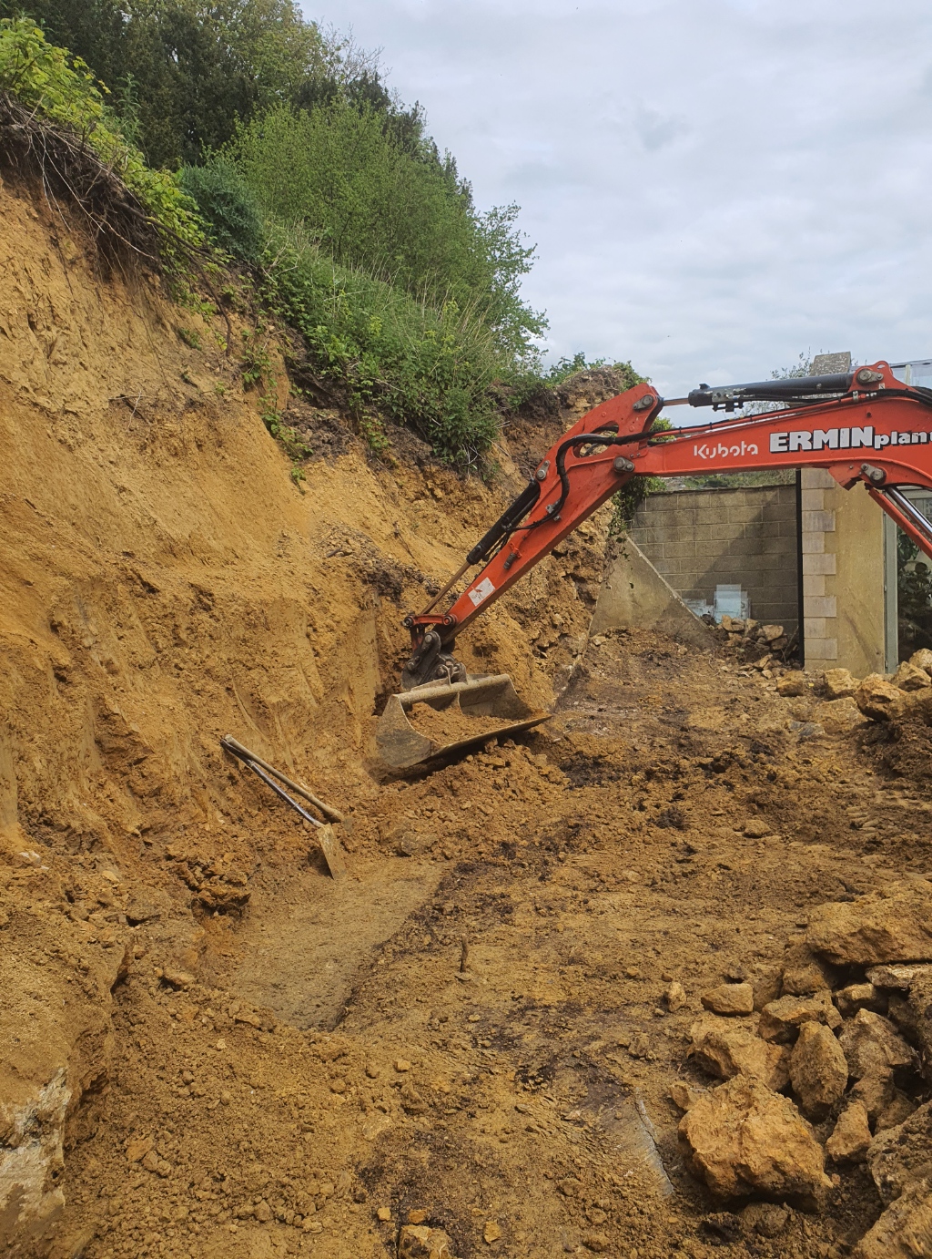 Excavating a collapsed existing wall, to replace with new retaining wall supported with buttress.